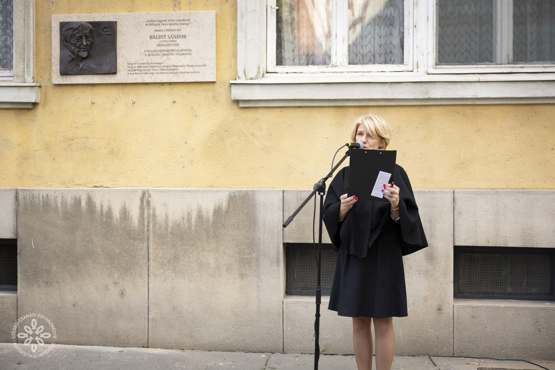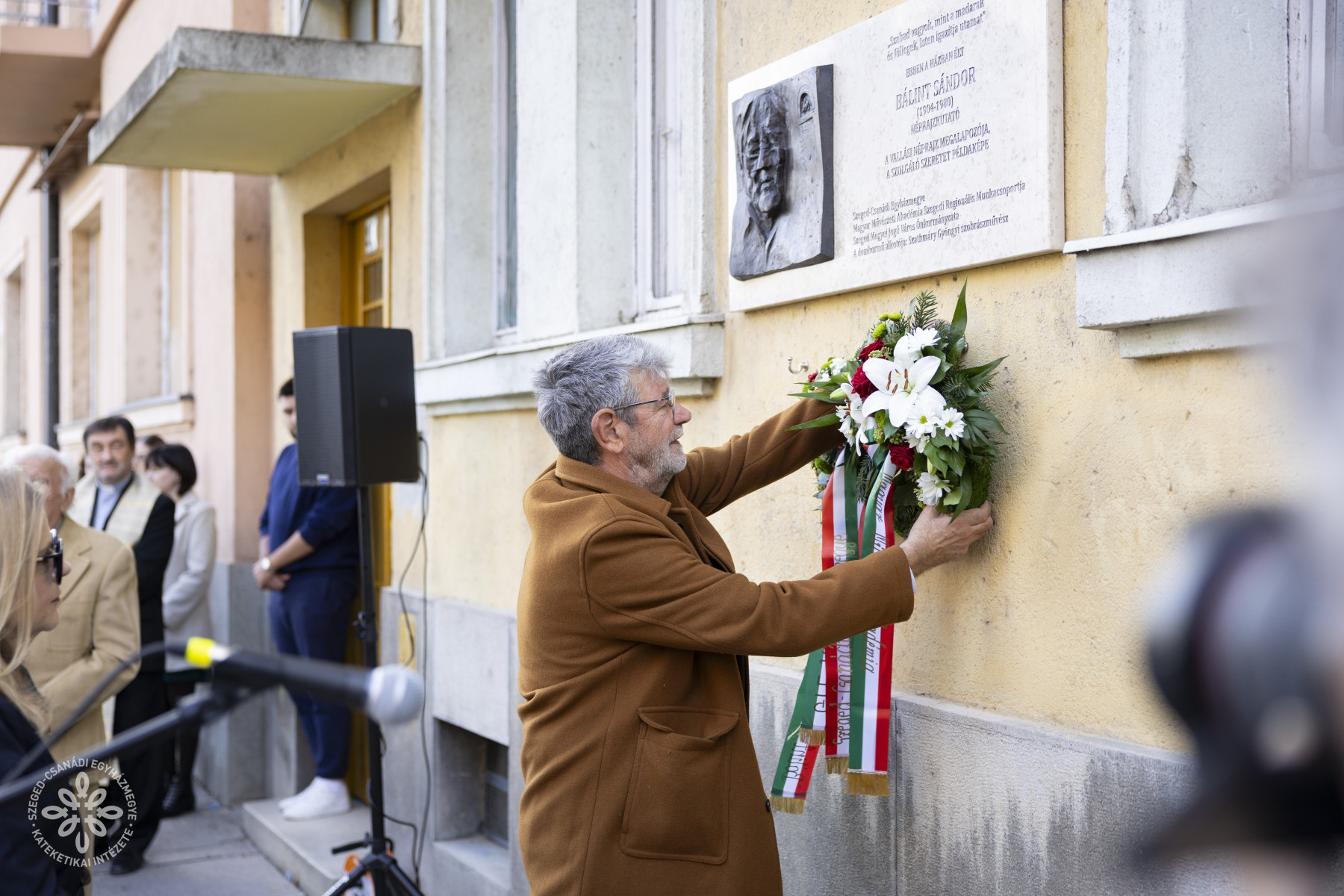 Alig van nemesebb emberi érzés, mint a kegyelet, az ősök érdeméről, életük példájáról való hálás megemlékezés – idézte a „legszögedibb szögedit”, hozzátéve, hogy a konferencia is ezt a nemes érzést hivatott szolgálni. A GFE frissen bemutatkozott Bálint Sándor Vallási Kultúrakutató Csoportja, valamint a Szeged-Csanádi Egyházmegye által szervezett konferencia nyitóelőadásában Serfőző Levente oktatási püspöki helynök adott átfogó képet Bálint Sándor élő tiszteletéről egyházmegyénkben, továbbá boldoggá avatásának aktuális állásáról.  Délután emléktáblát avattak a Magyar Művészeti Akadémia Szegedi Regionális Munkacsoportja, a Szeged-Csanádi Egyházmegye és az önkormányzat együttműködésében Bálint Sándor egykori Tömörkény utcai lakóházánál, ahol 1942-től haláláig, 1980-ig élt. Dux László, a GFE rektora beszédében kiemelte, hogy aki elmegy az emléktábla előtt, jusson eszébe Bálint Sándor emléke, életáldozata, és mondjon el egy fohászt azért, hogy boldoggá avatása minél előbb eredményes legyen – fogalmazott a rektor.  Az emléktáblát a Dóm plébánosa, Kondé Lajos pasztorális püspöki helynök áldotta meg, majd a megjelentek együtt mondták el a Gyulay Endre nemrég elhunyt megyéspüspök által írt imát Bálint Sándor boldoggá avatásáért.
